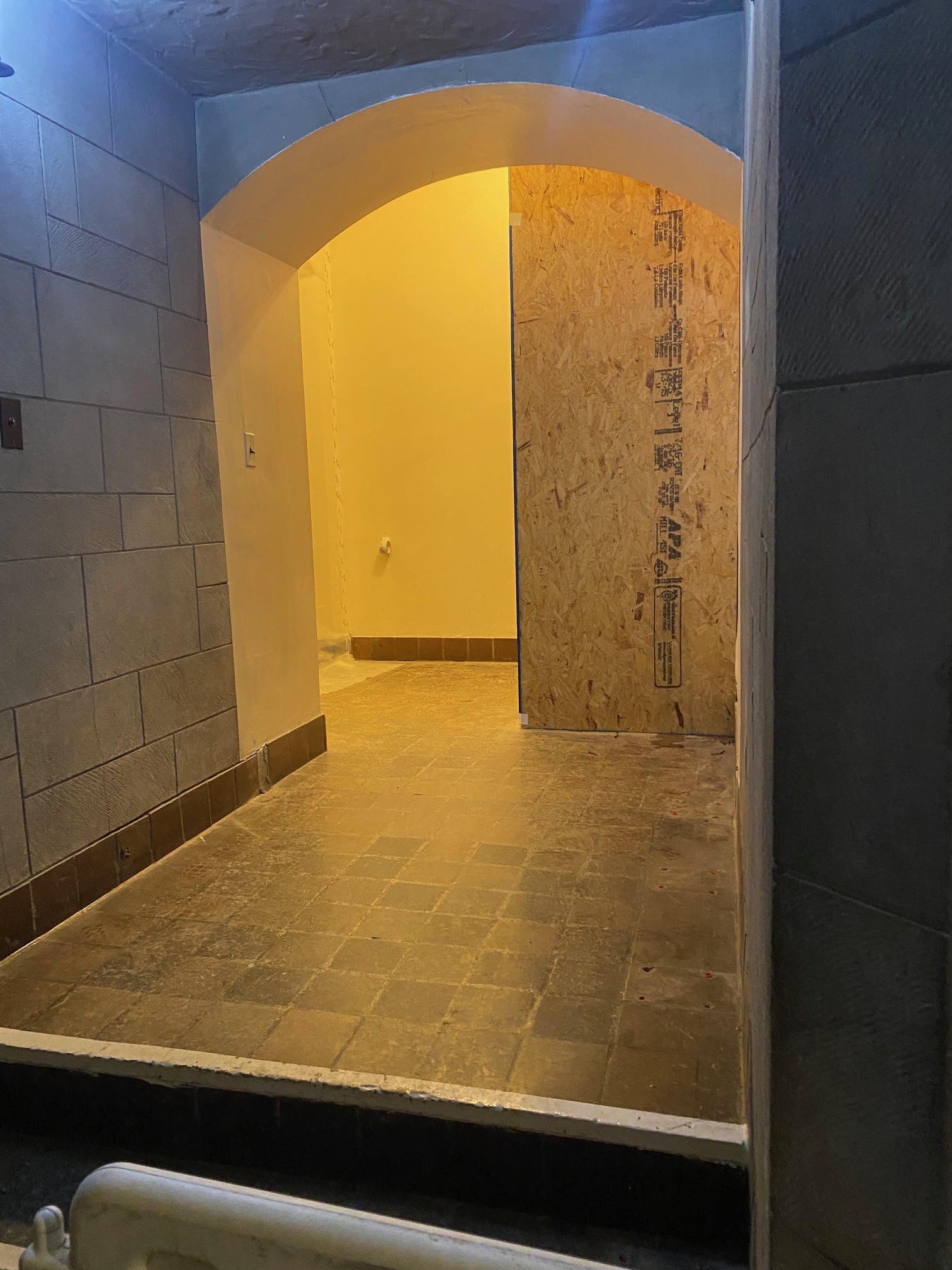 The plaster was stripped from the walls where the new opening will be cut this week. Once the walls have been opened and the rubble removed, the glass enclosures will be installed.