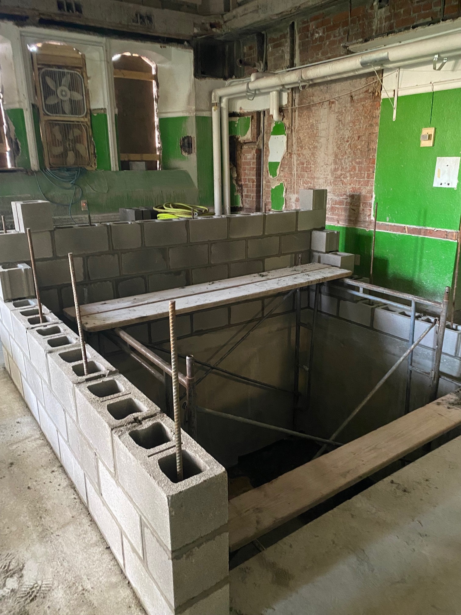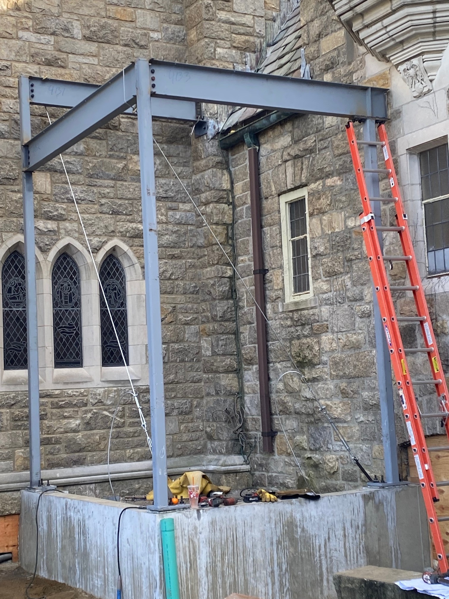 Update as of October 24:  Progress continues at a good pace on our accessibility project. Since our last update: Forms have been built and concrete has been poured for the footings at the Vincent Hall parking lot entry.  The elevator pit inside the building’s Junior Achievement Room reached full depth with walls and floor formed and poured.  Work at the chapel lift area has continued with additional engineered drawings, backfill, and relocation of Comcast’s equipment box.
