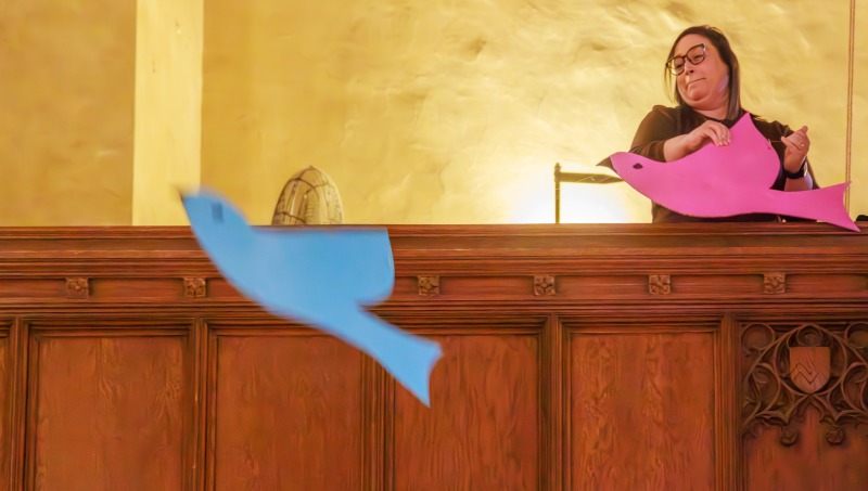 The theme for week 2 (March 1) was Birds. At the beginning of the children's message, 3 paper birds flew into the sanctuary and landed in front of the lectern. The children painted pictures of birds during fellowship hour.